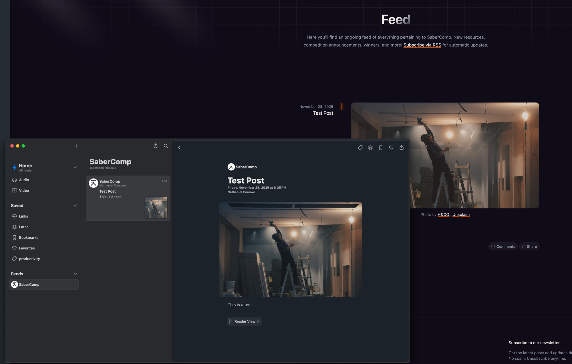 I've been tackling a rebuilding the SaberComp front-end site on a new platform: Ghost. The main things I'm looking to leverage are the built-in newsletter delivery, and the news feed, which should allow us a much more robust way to get the latest news regarding the competitions and general goings on around the community... to the community.