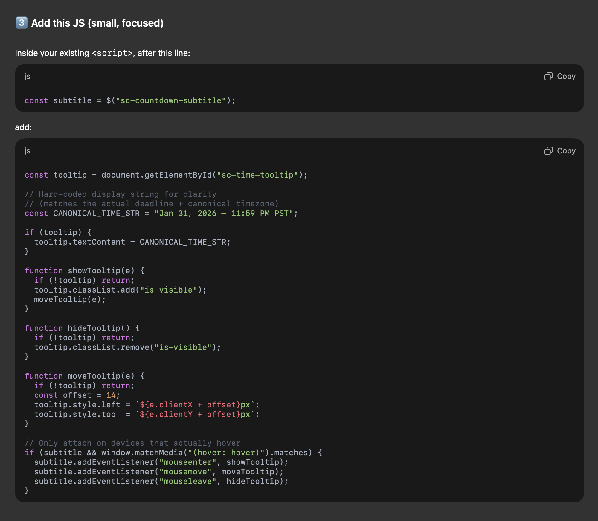 However, said service finally seems to have taken a turn for the worse. They moved to a new design engine, which was actually much more restrictive than before, and I could no longer access my previous countdowns. So I decided to let ChatGPT take a stab at it. I presented it with the WIP homepage and told it I needed a persistent countdown that sat at the bottom of the page and to style it to match the site.