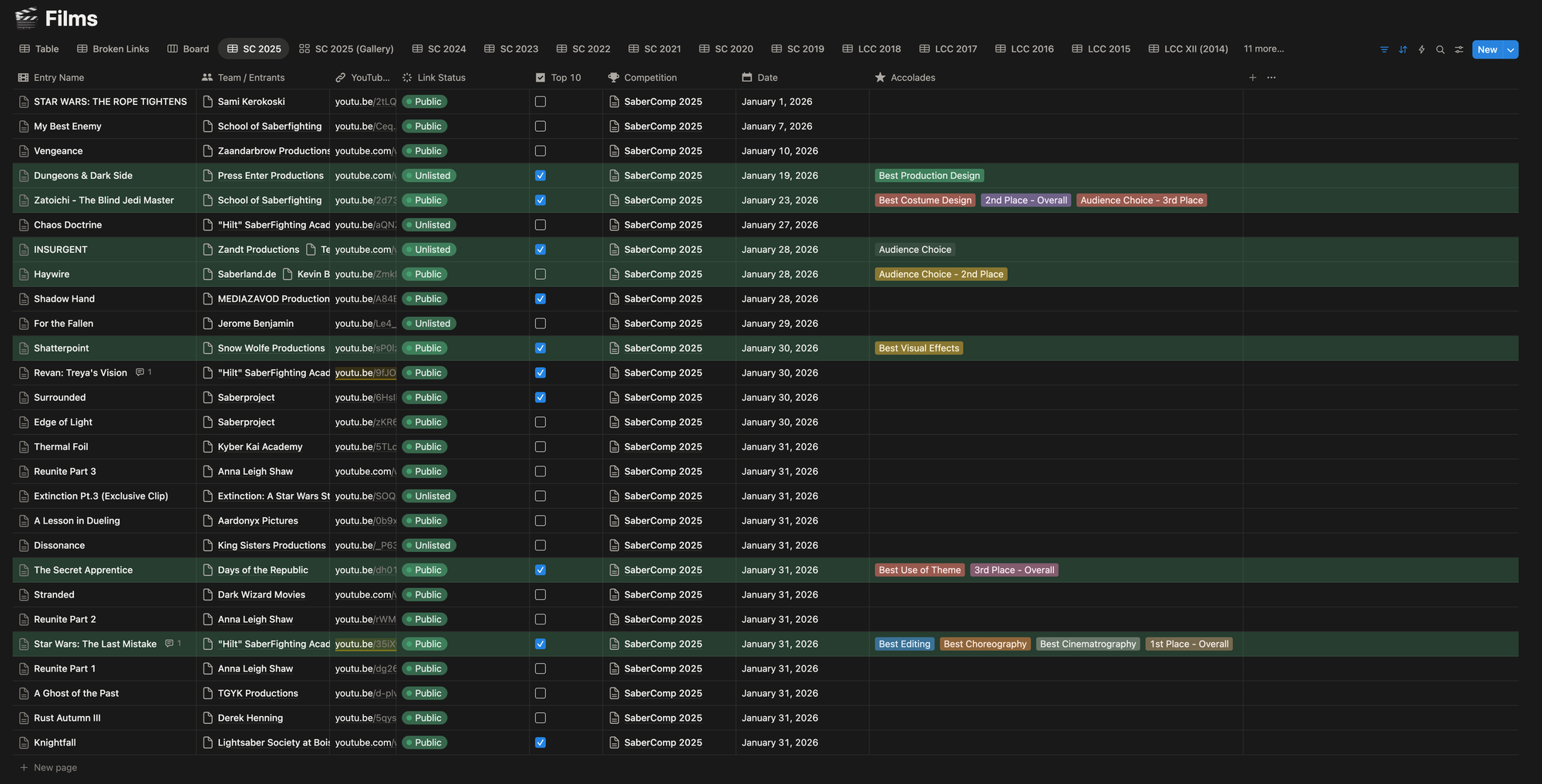 Every film that's been submitted over the past few years lives in a Notion database—title, creator, competition year, YouTube link, the works. It's a pretty comprehensive record of the community's output, and a place where the admin team can check for any info we have on an entry (cross-linking creators is where it gets really cool).